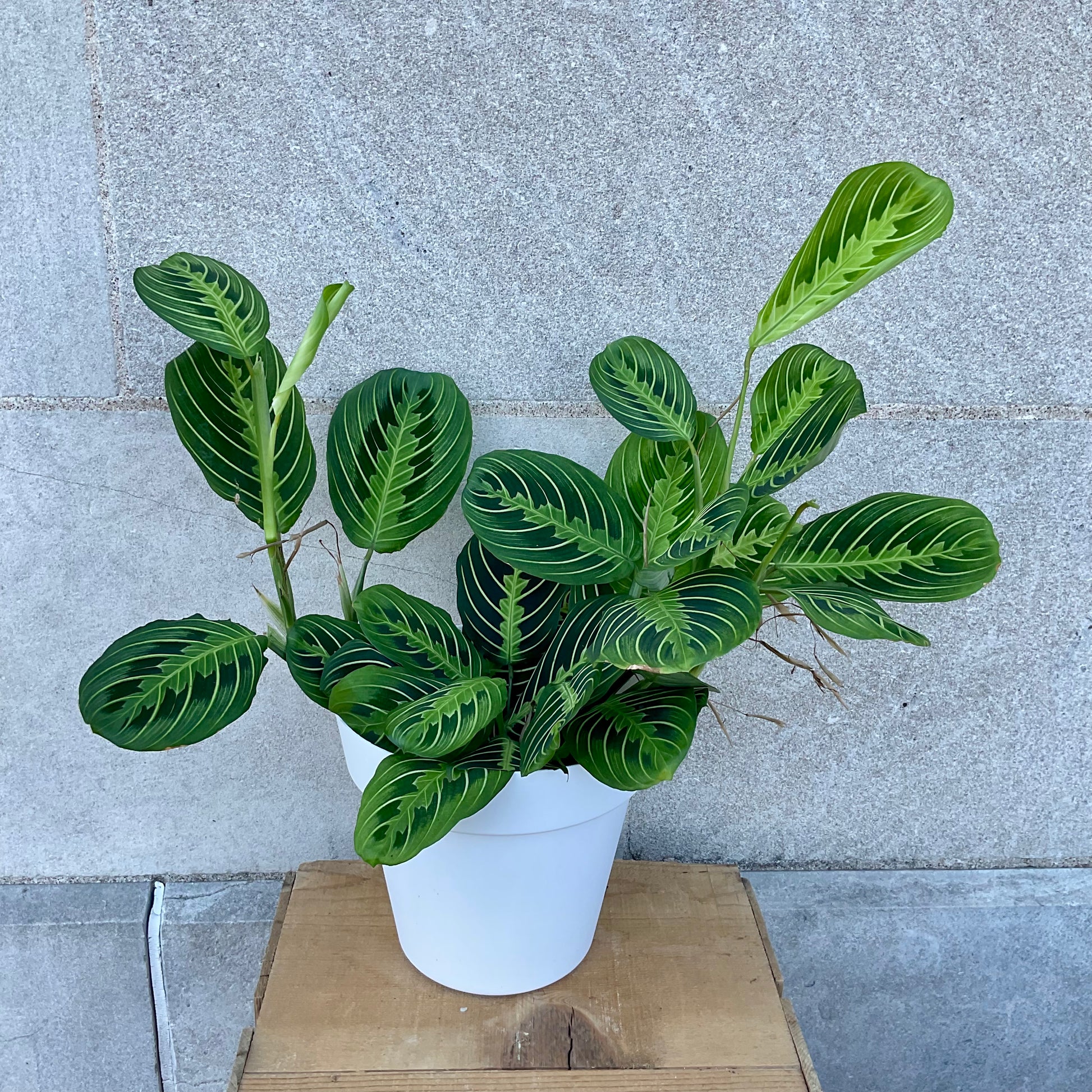 With it, striking patterned leaves that fold up at night like praying hands. The prayer plant brings a touch of the tropics and a sense of calm to any space. It’s vibrant, green tones with red veins and a unique pattern making it a true conversation, perfect for low to medium light conditions. This is an easy care plant